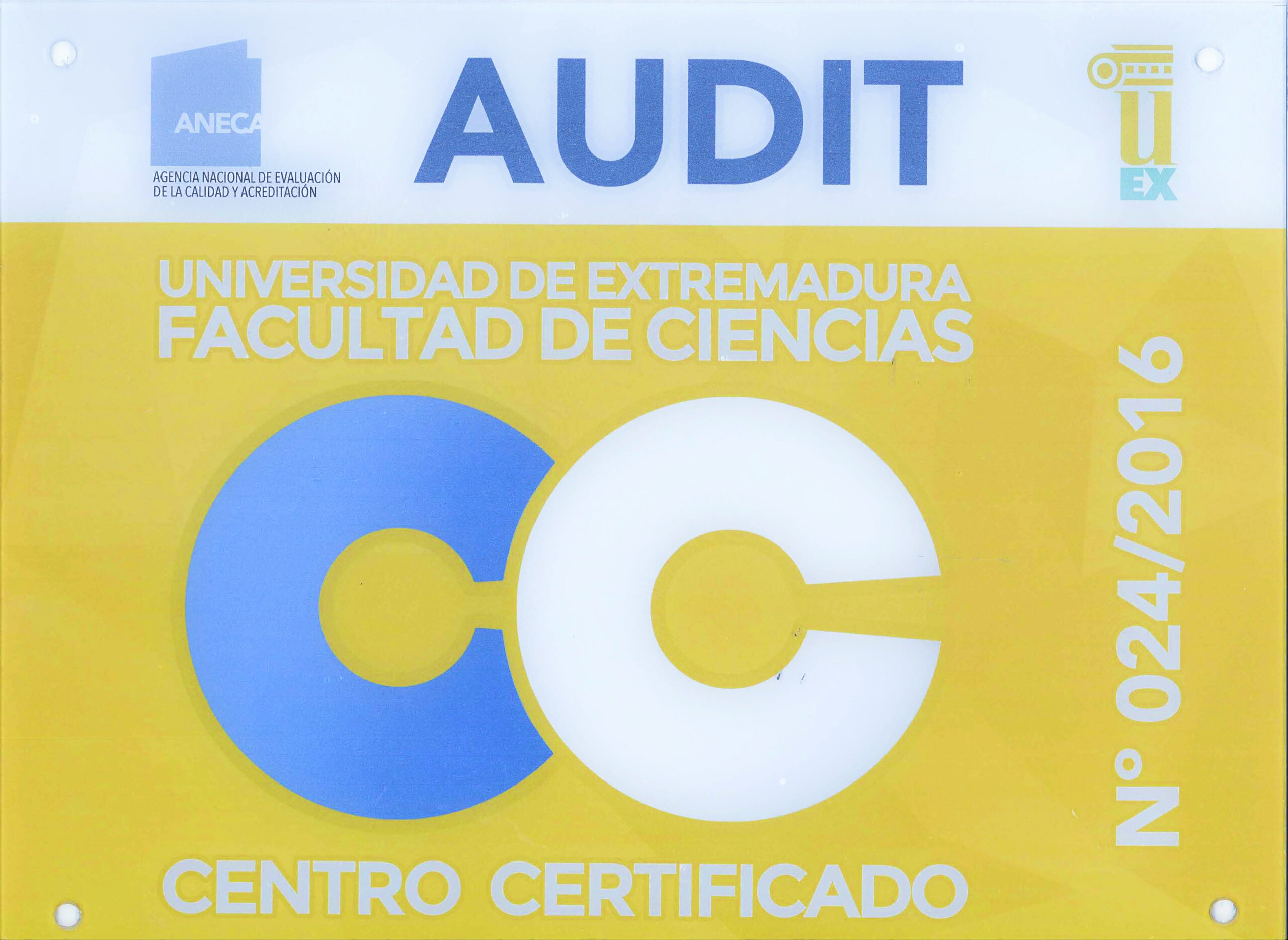 La Agencia Nacional de la Calidad y Acreditación (ANECA) ha emitido un certificado acerca de la adecuación del diseño del Sistema de Garantía Interna de Calidad (SGIC) de la Universidad de Extremadura aplicable a las enseñanzas oficiales impartidas en la Facultad de Ciencias conforme a las normas y directrices establecidas en el programa AUDIT para el diseño y desarrollo de Sistemas de Garantía Interna de Calidad de la formación universitaria.